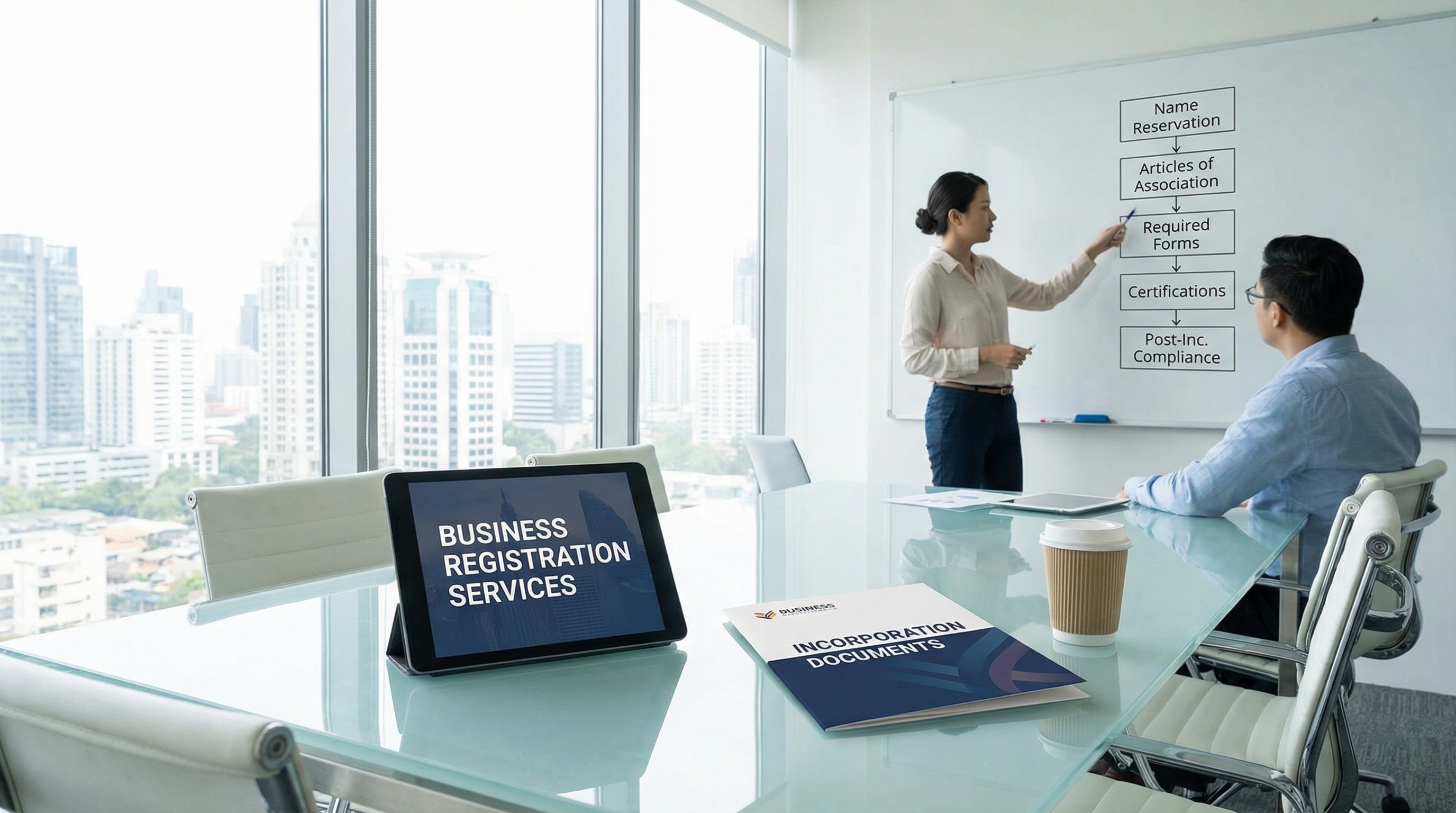 Name reservation, incorporation documents, Articles of Association, required forms, certifications, post incorporation compliance guidance.