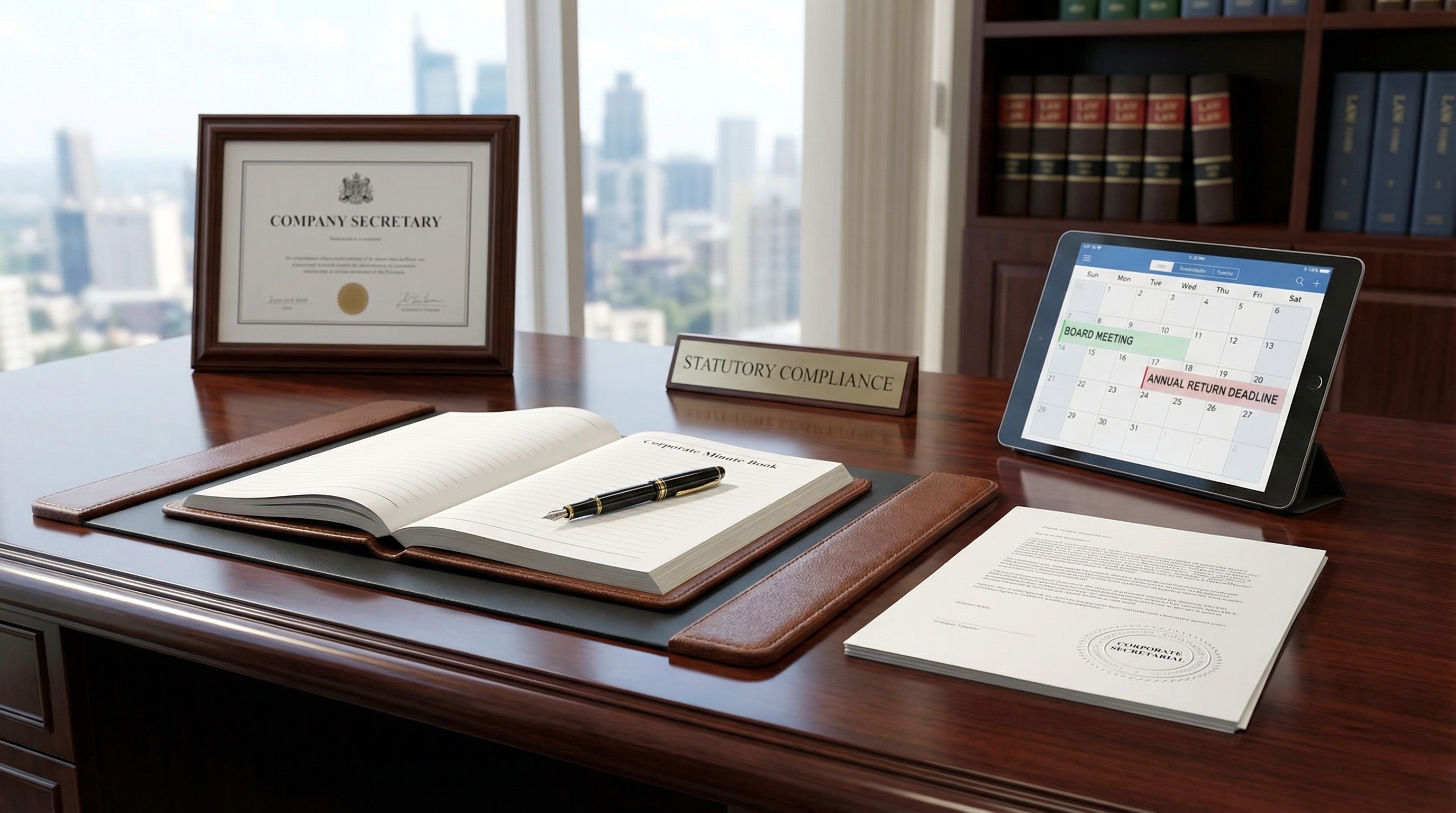 Statutory compliance support for companies under the Companies Act. Board and general meeting coordination, minutes, resolutions, registers, annual returns, restructuring guidance, strike offs and related filings.